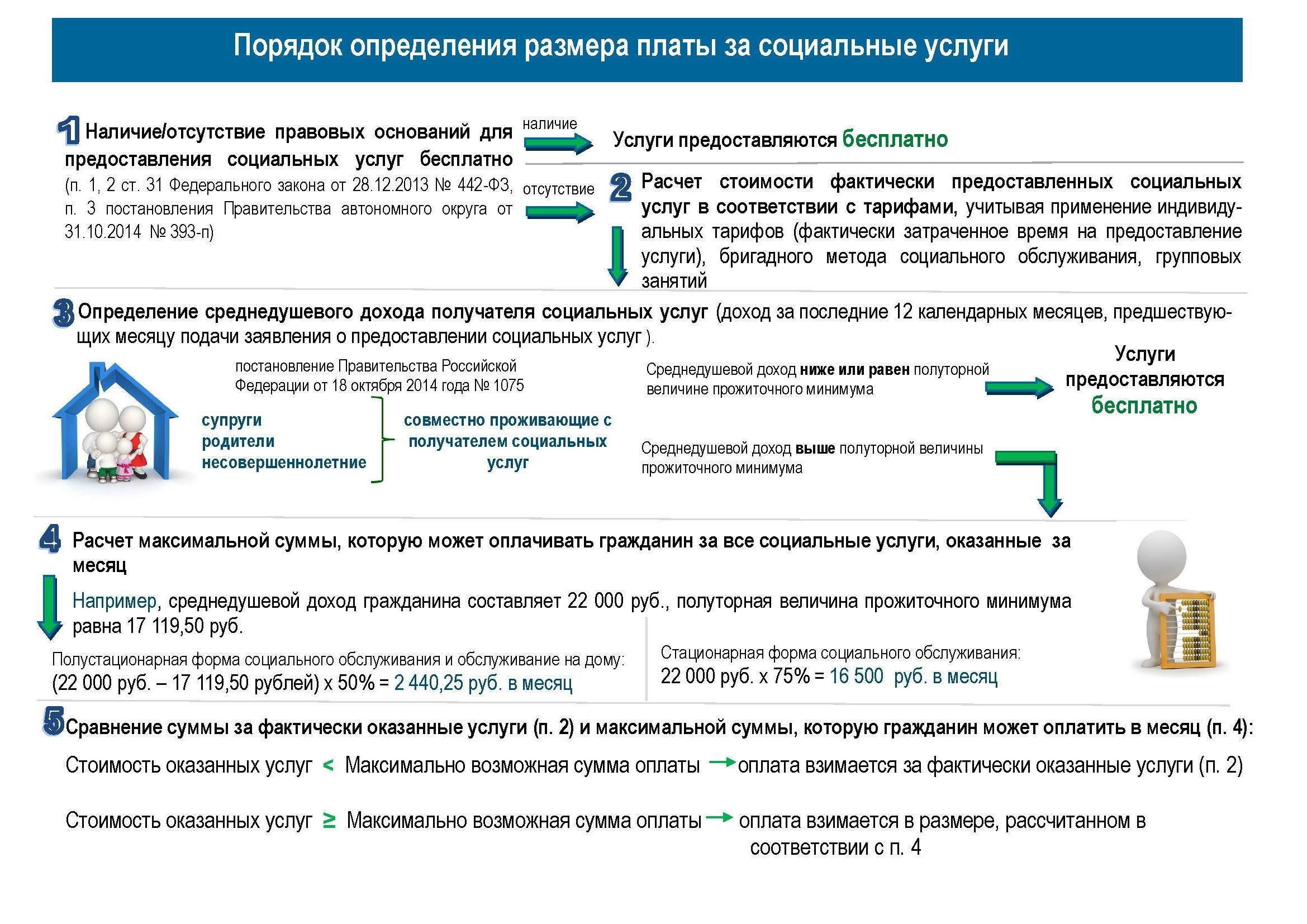 - при оказании социальных услуг в форме социального обслуживания на дому и в полустационарной форме социального обслуживания - пятидесяти процентов разницы между величиной среднедушевого дохода получателя социальной услуги, рассчитанного в соответствии с утвержденным Правительством Российской Федерации порядком определения среднедушевого дохода для предоставления социальных услуг бесплатно, и предельной величиной среднедушевого дохода для предоставления социальных услуг бесплатно в Ханты-Мансийском автономном округе - Югре;